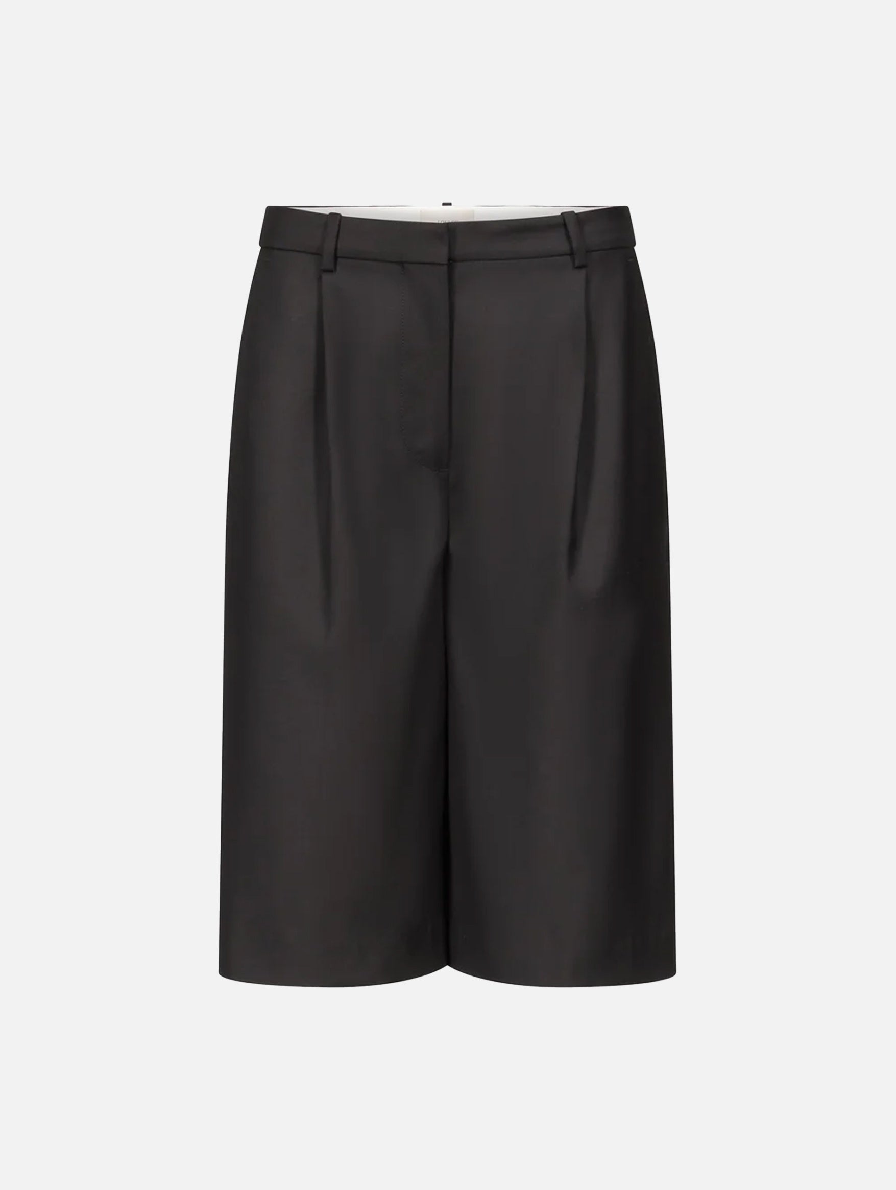 Adler Wool Bermuda Shorts in Black by Loulou de Saison turns structure into style. Crafted from Super 120s virgin wool, these berms balance fluid drape with sharp tailoring through front pleats, a relaxed mid-rise cut, and angled side pockets. Pairs effortlessly with a structured blazer for a bold head-to-toe look, or contrast with a crisp white tank and whisper of gold jewellery for elegant ease.