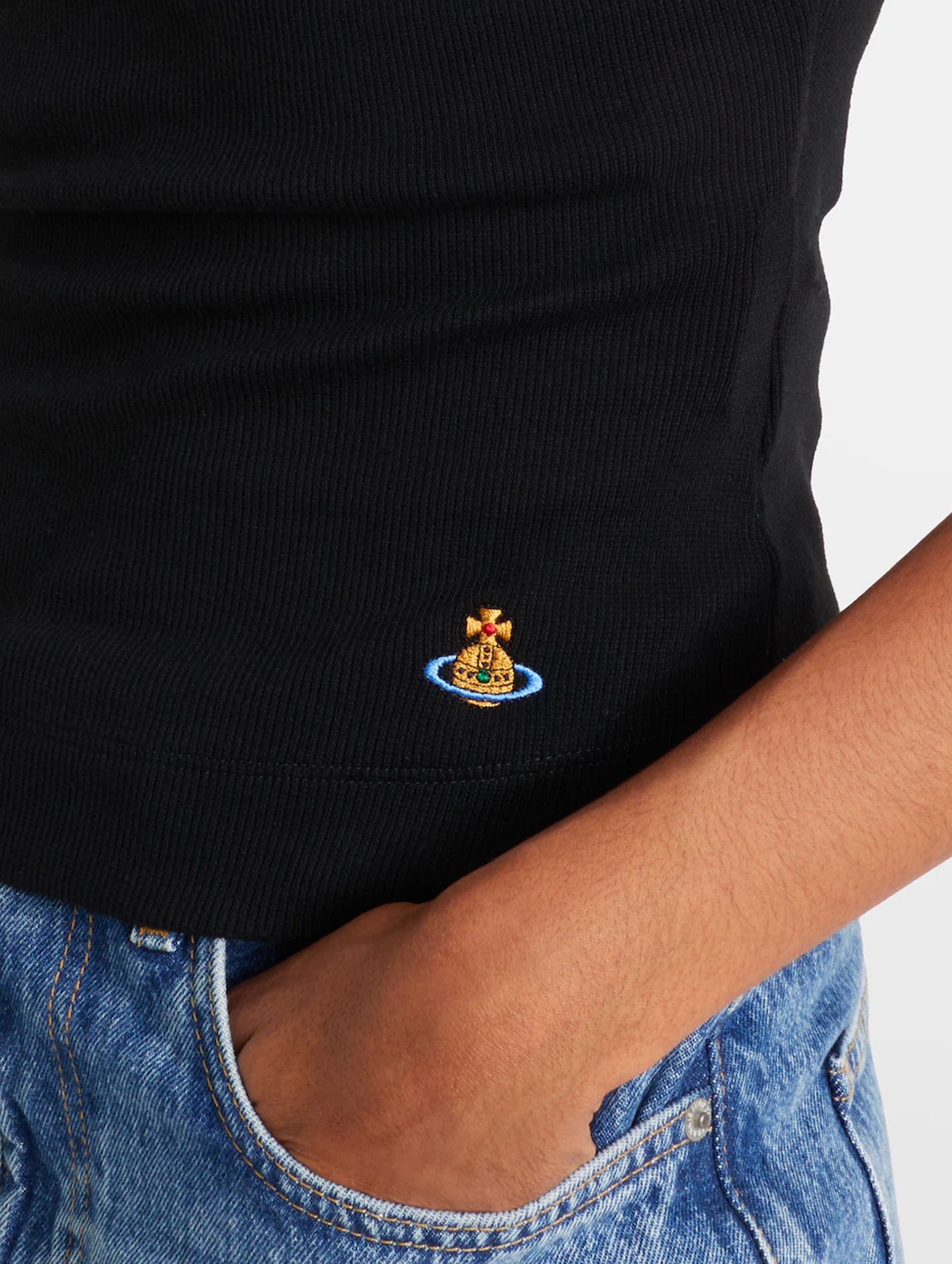 The Vivienne Westwood Anna Top in Black is a refined essential with a sculptural spirit. Cut from sleek fabric with a flattering silhouette and signature design details, it balances timeless elegance with modern edge. Wear it with tailored trousers or a high‑waist skirt for a polished look that feels both poised and effortlessly stylish.