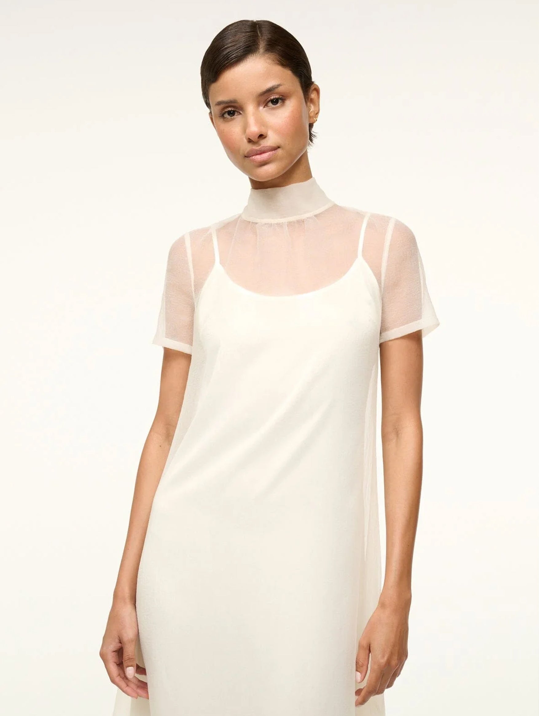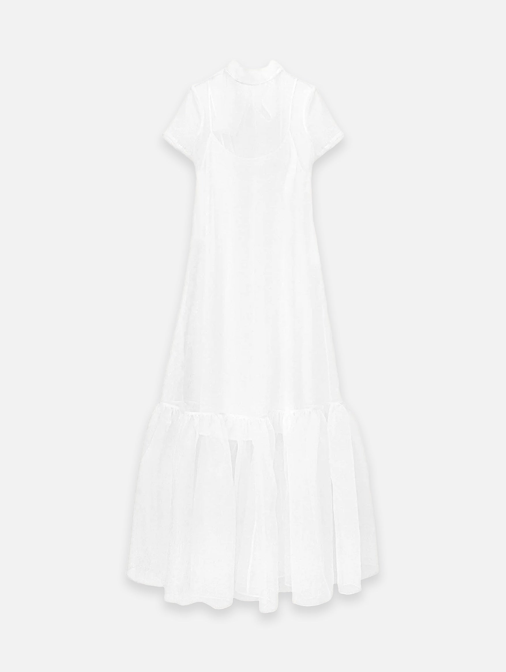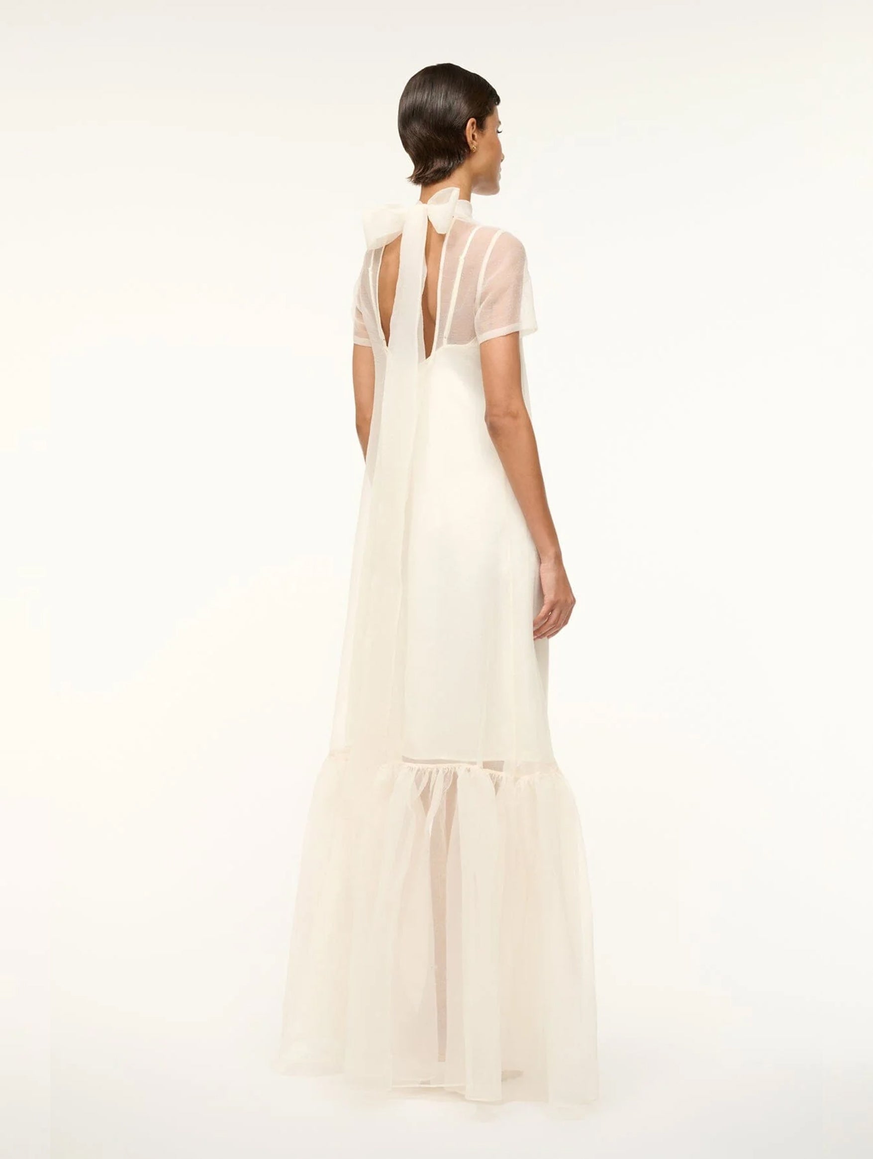 Turn heads in the beautiful Calluna Dress in White from Staud. This semi-sheer design plays with opacity and coverage through its organza layers, tonal cotton lining, tiered ruffle skirt, and long self-ties at the back of the neck. Perfect for your next special occasion, it's cut from organza to perfectly hold the oversized silhouette and ruffled hem.