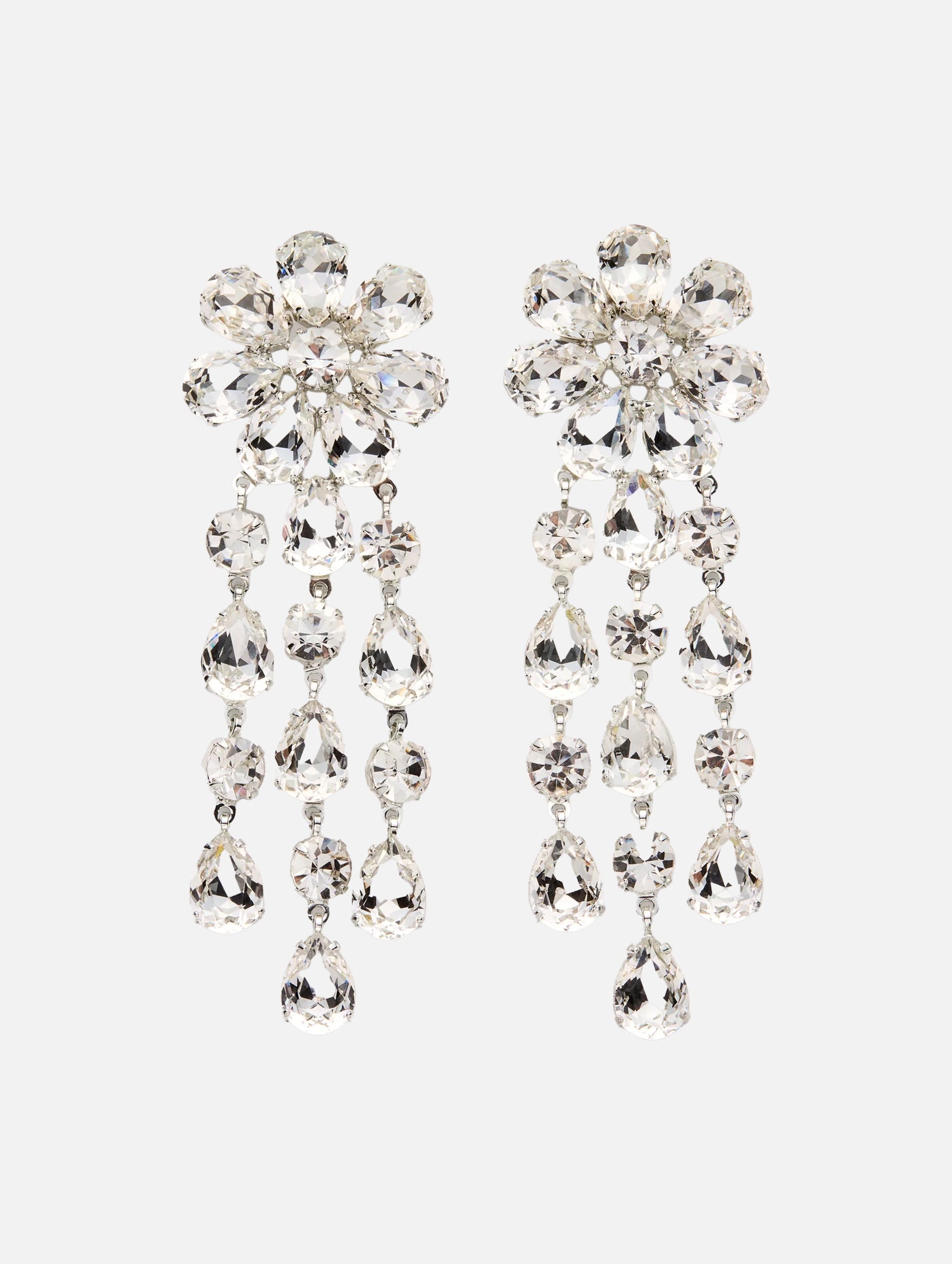 These exquisite chandelier earrings from Magda Butrym's AW25 collection are a testament to refined glamour. Crafted from hypoallergenic plated brass, they feature a floral cluster of faceted crystals at the lobe, leading to cascading strands of teardrop and round-cut stones. The dynamic silhouette adds movement and brilliance, making them a striking accessory for evening occasions.