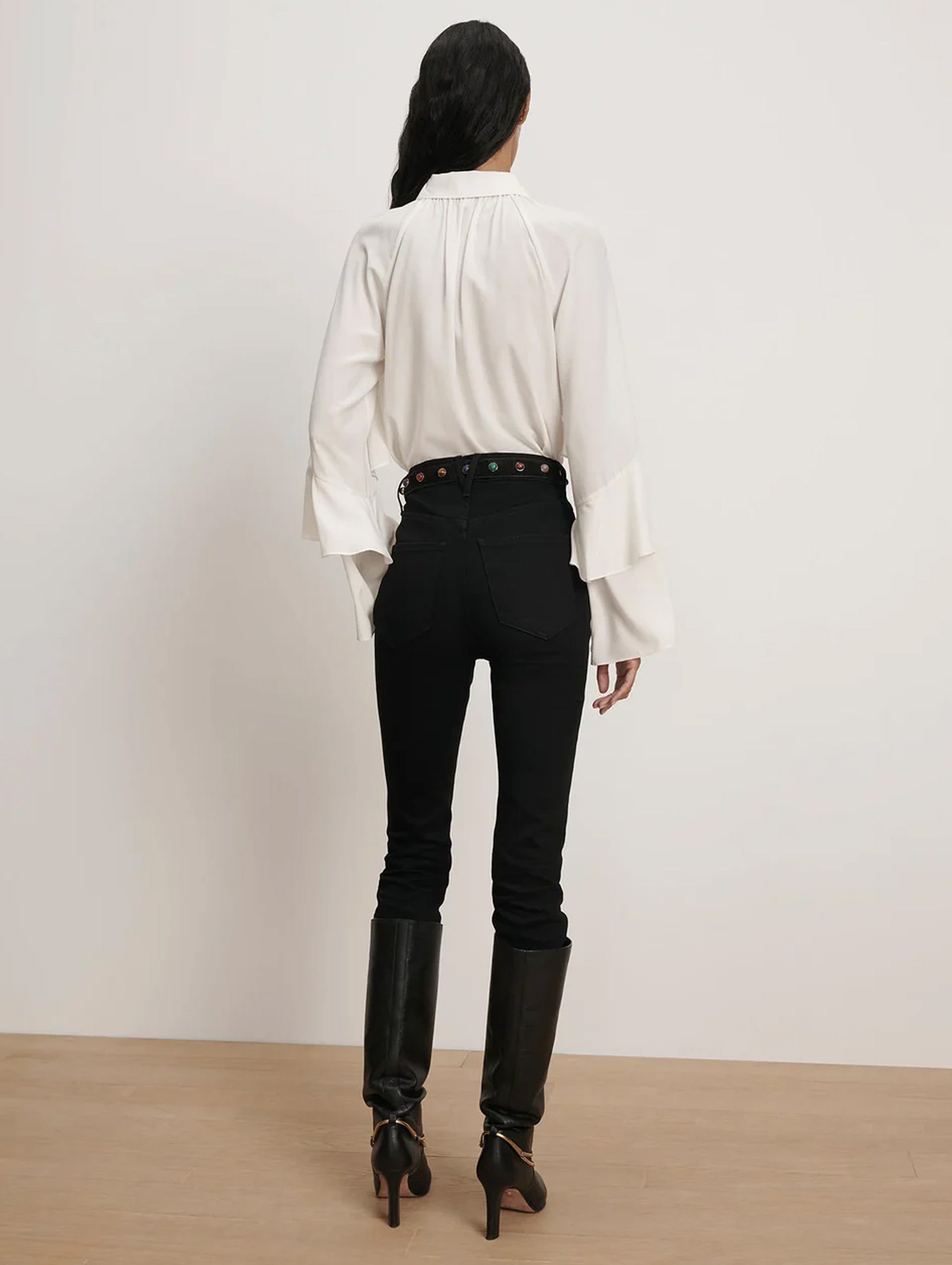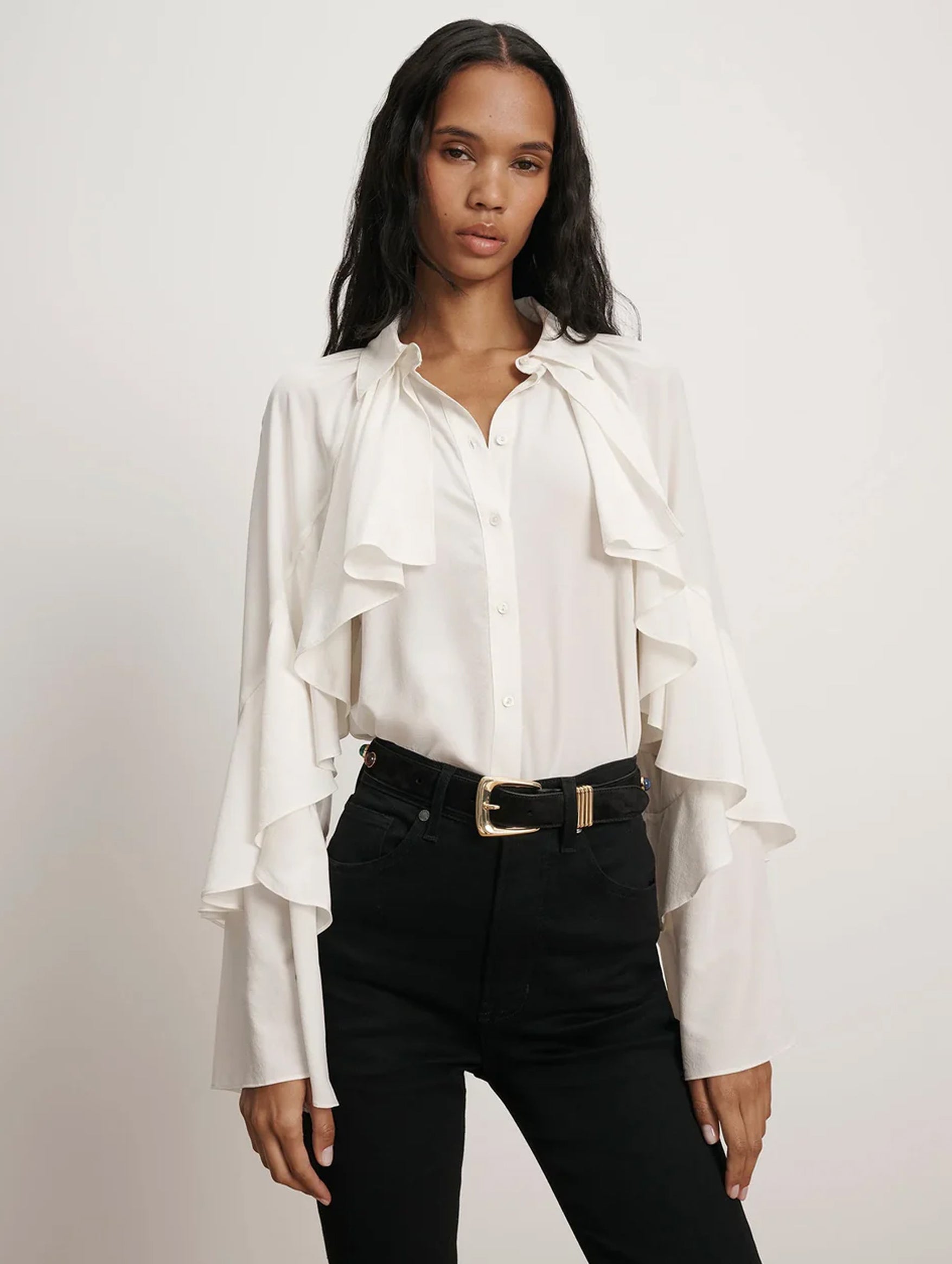 The Demaris Blouse by Veronica Beard is a statement piece that effortlessly combines classic tailoring with feminine flair. Crafted from a luxurious silk blend. this blouse offers both comfort and elegance. Its design features cascading ruffles that gracefully drape from the shoulders down the length of each arm, creating a soft, fluid silhouette. The flared sleeves and real shell buttons add subtle yet sophisticated details, enhancing its timeless appeal.