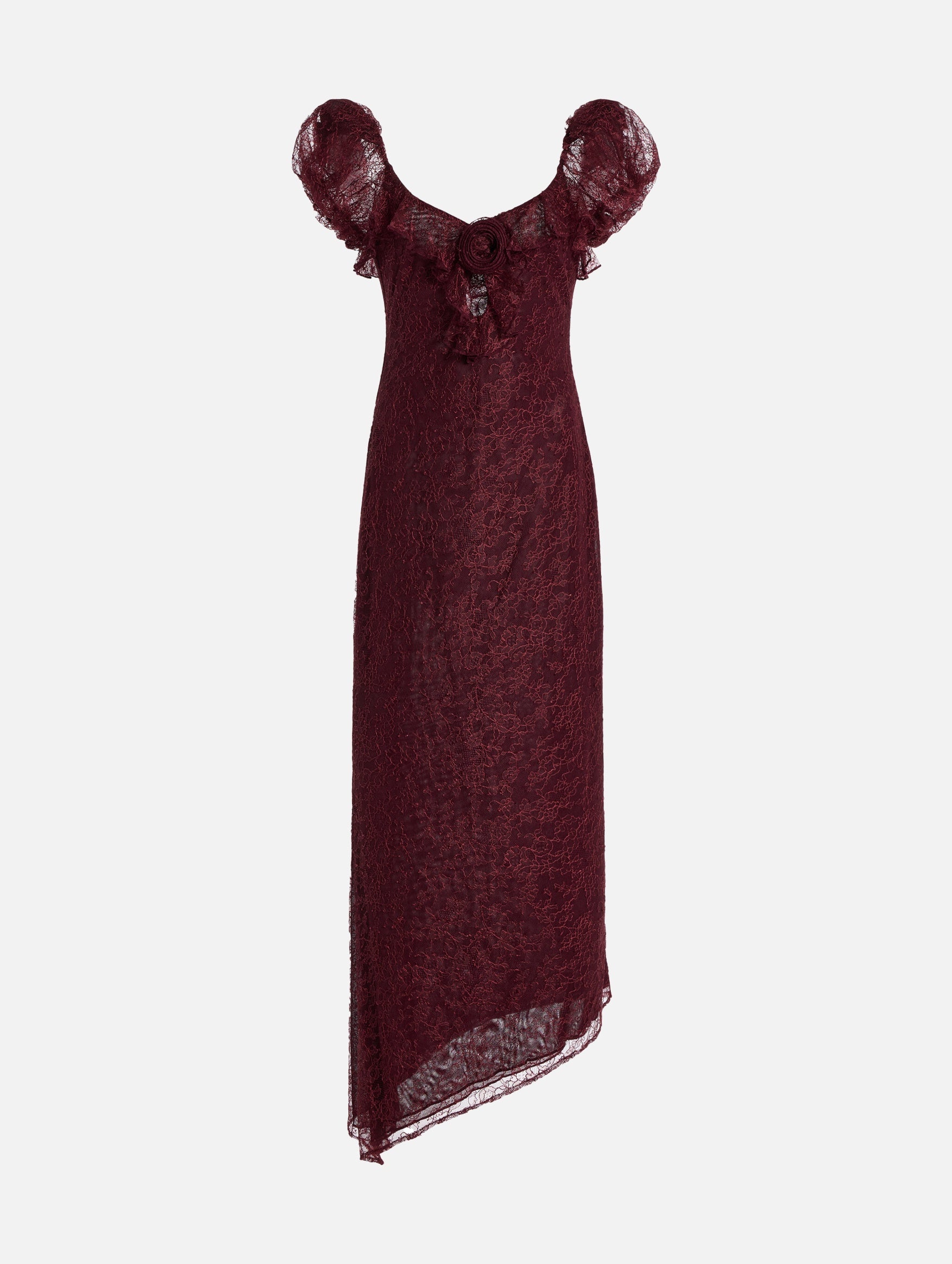 The Eden Midi Dress in Earth by De La Vali is a captivating embodiment of romantic sophistication. Crafted from a rich burgundy lace, this dress features a short blouson sleeve and a ruffled bust detail, adorned with a delicate rose appliqué that adds a touch of femininity. The asymmetric hemline enhances its graceful silhouette, while the side zip detail ensures a flattering fit. Designed in London and Ibiza, this dress is a testament to De La Vali's commitment to timeless elegance.