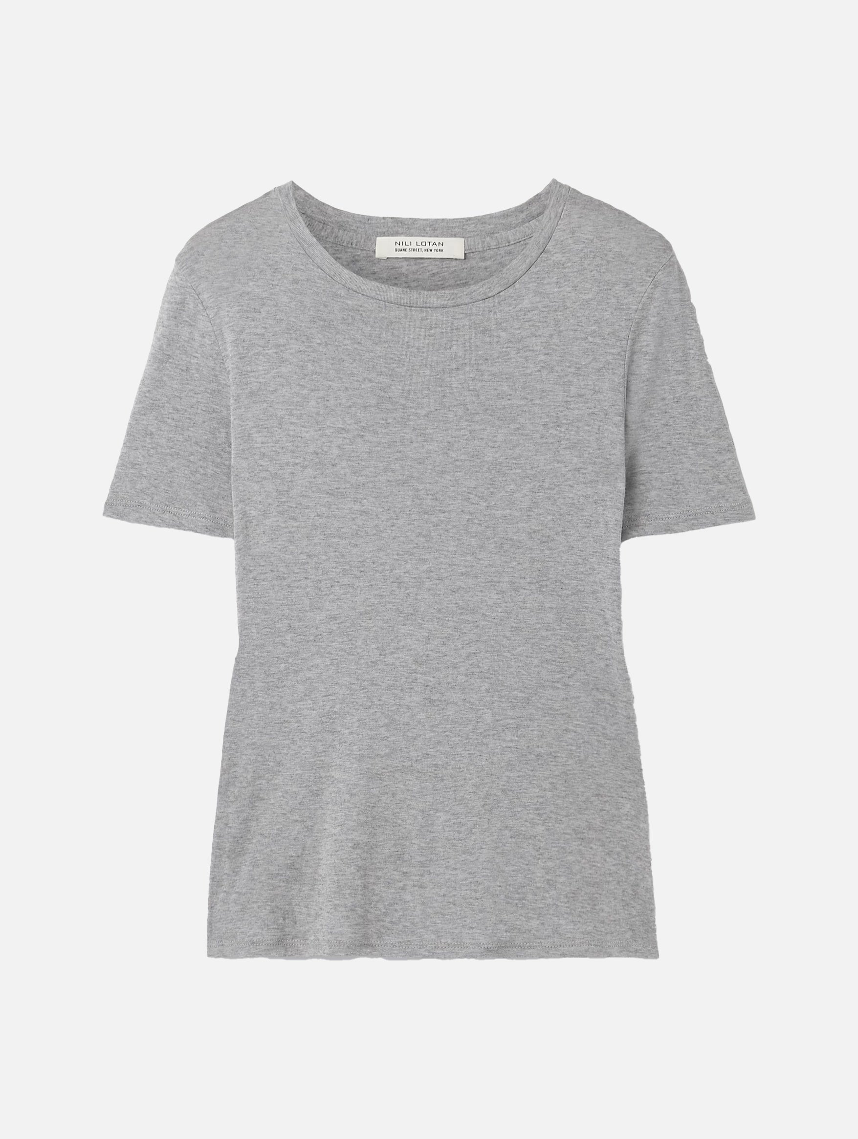 The Elin Tee in Heather Grey by Nili Lotan is a refined take on the classic crewneck t-shirt. Crafted from lightweight American cotton, it features a slim fit that gently contours the body. The self-trimmed neckline and topstitch detailing add subtle sophistication, while the interior binding at the shoulder and back neck ensures comfort and durability. Finished with a cover-stitched hem and sleeve, this tee is a versatile wardrobe staple that pairs effortlessly with both casual and tailored pieces.