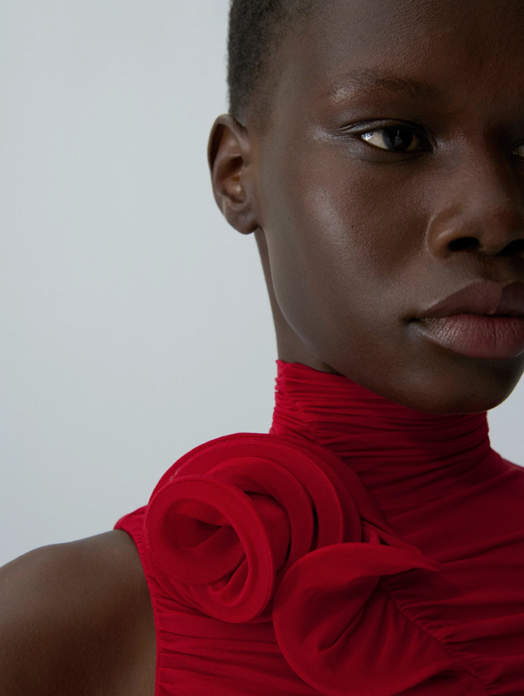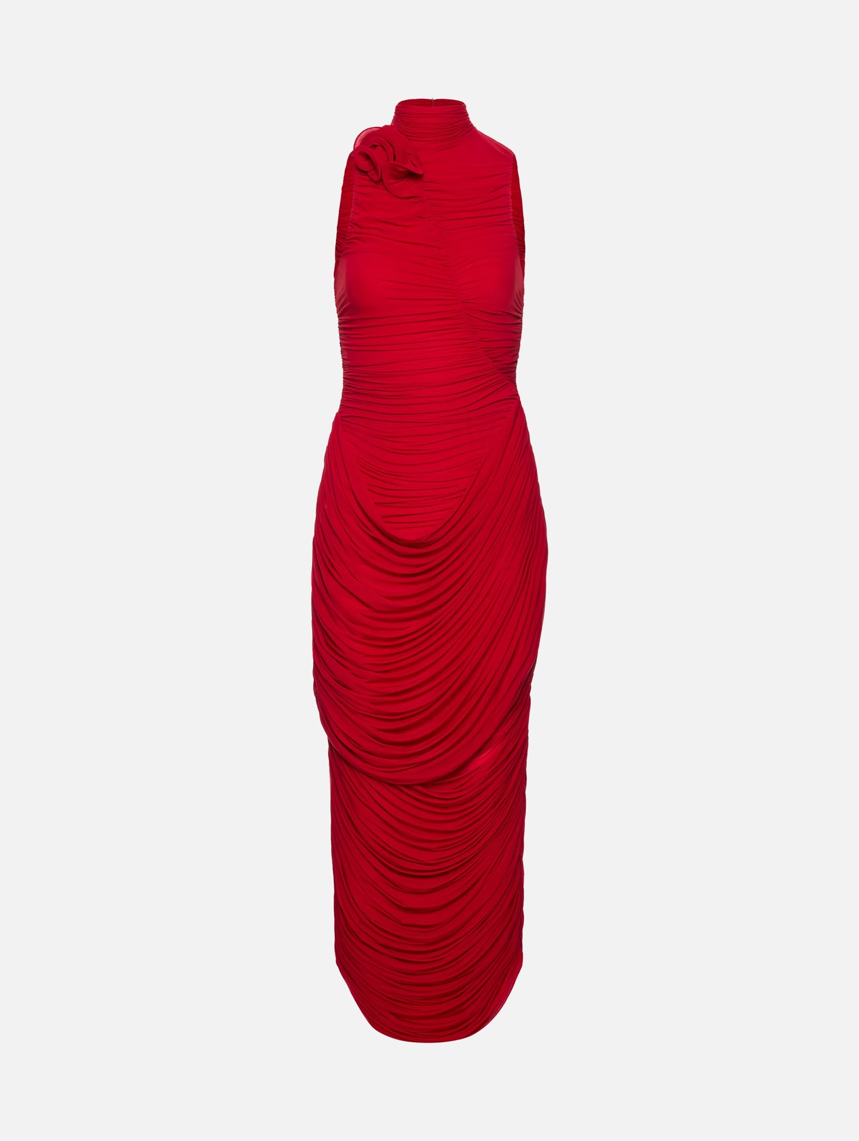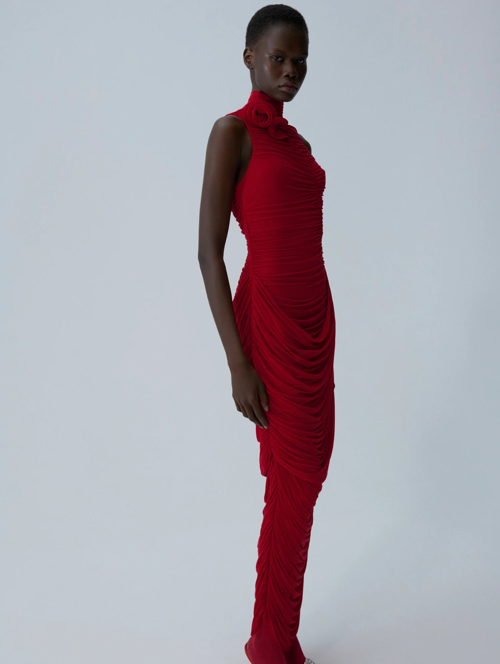 Embrace a sculptural silhouette with the Floral-appliqué Draped Gown in Red in Red by Magda Butrym. This sleeveless midi dress features a ruched high neckline and sculptural floral detailing at the front. Expertly draped throughout, with gathered seams at the sides, back, and hips, the silhouette is enhanced by layered ruching that adds dimension and movement. Finished with a concealed zip closure at the back and an interior bodysuit for structure and support, this piece is equal parts eye-catching and modern.