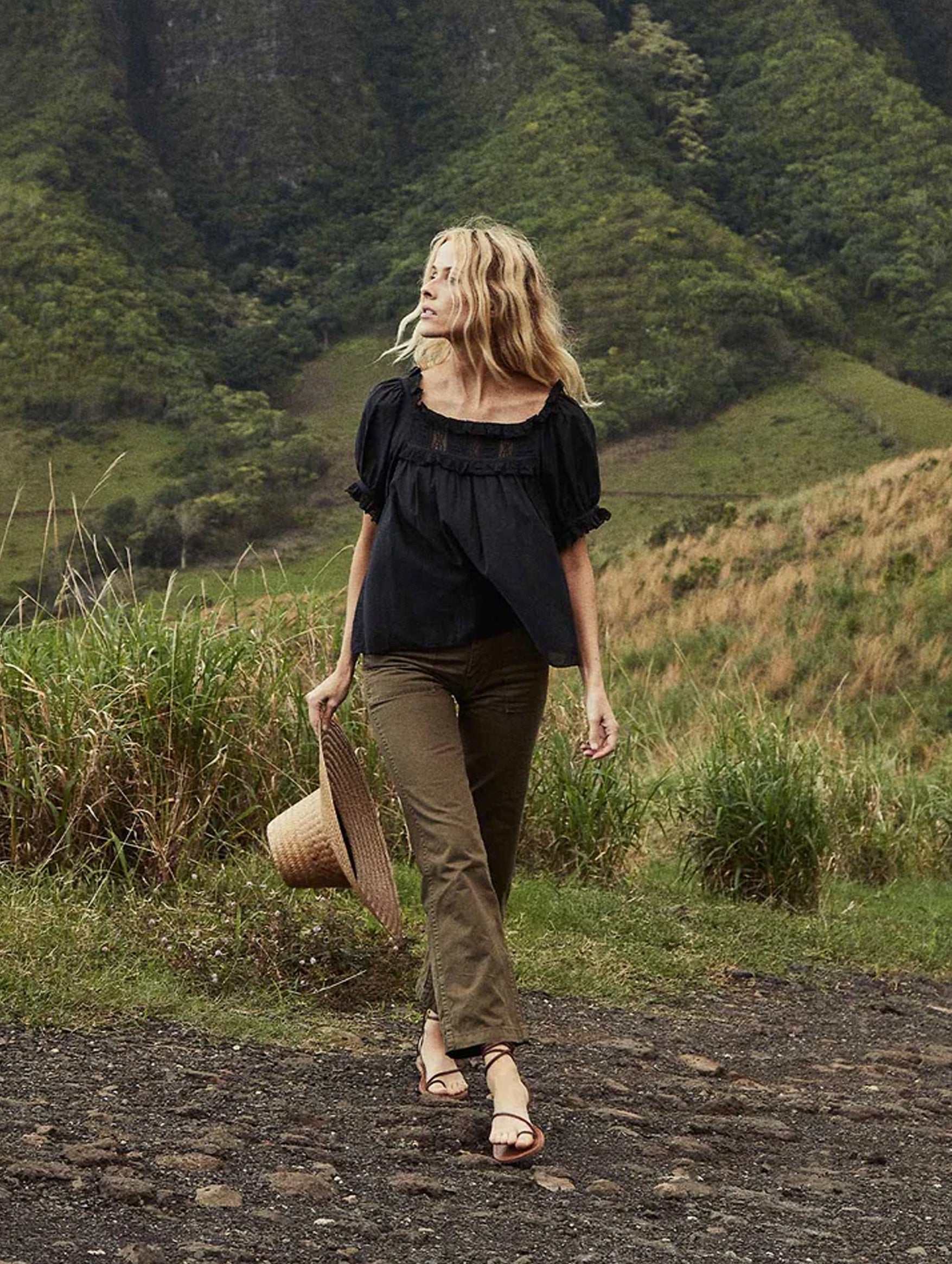 In a soft, lightweight blend of organic cotton and viscose, DÔEN's Frances Top in Black is a favourite for feminine styling. It features a breezy silhouette, a square neckline, and short puffed sleeves trimmed with petite ruffles. A square yoke is adorned with alternating panels of ruching and inset lace. Leave it loose, or tuck it into your favorite pair of high-waisted jeans.