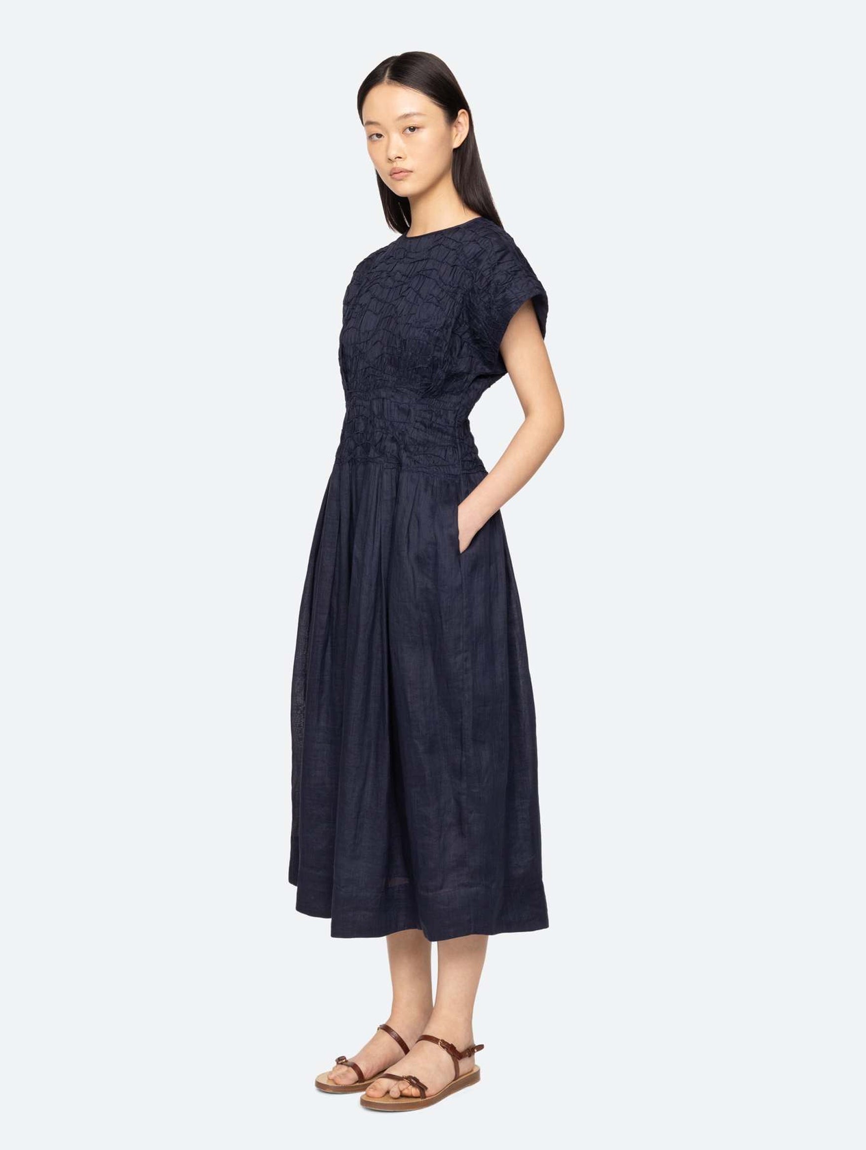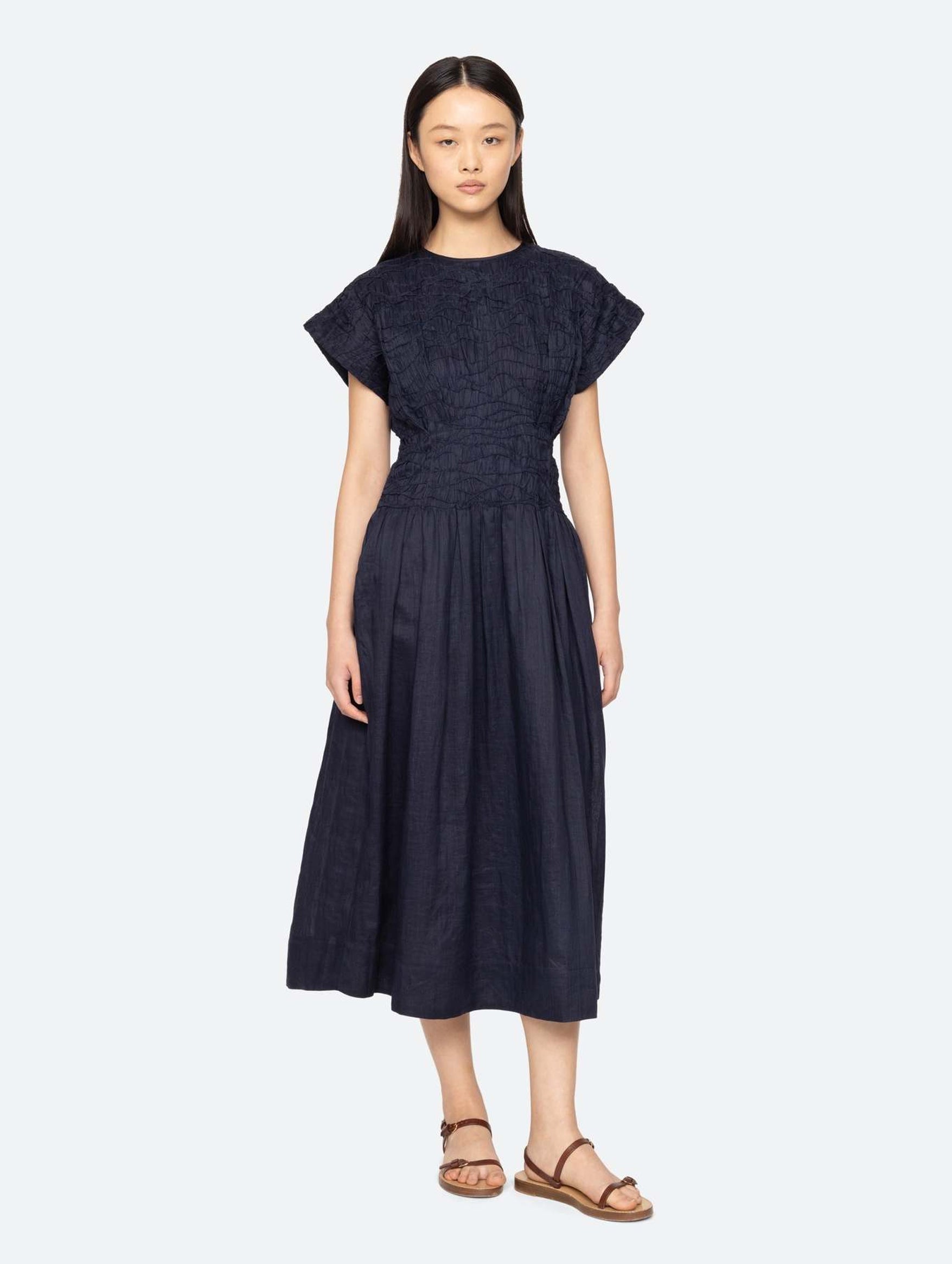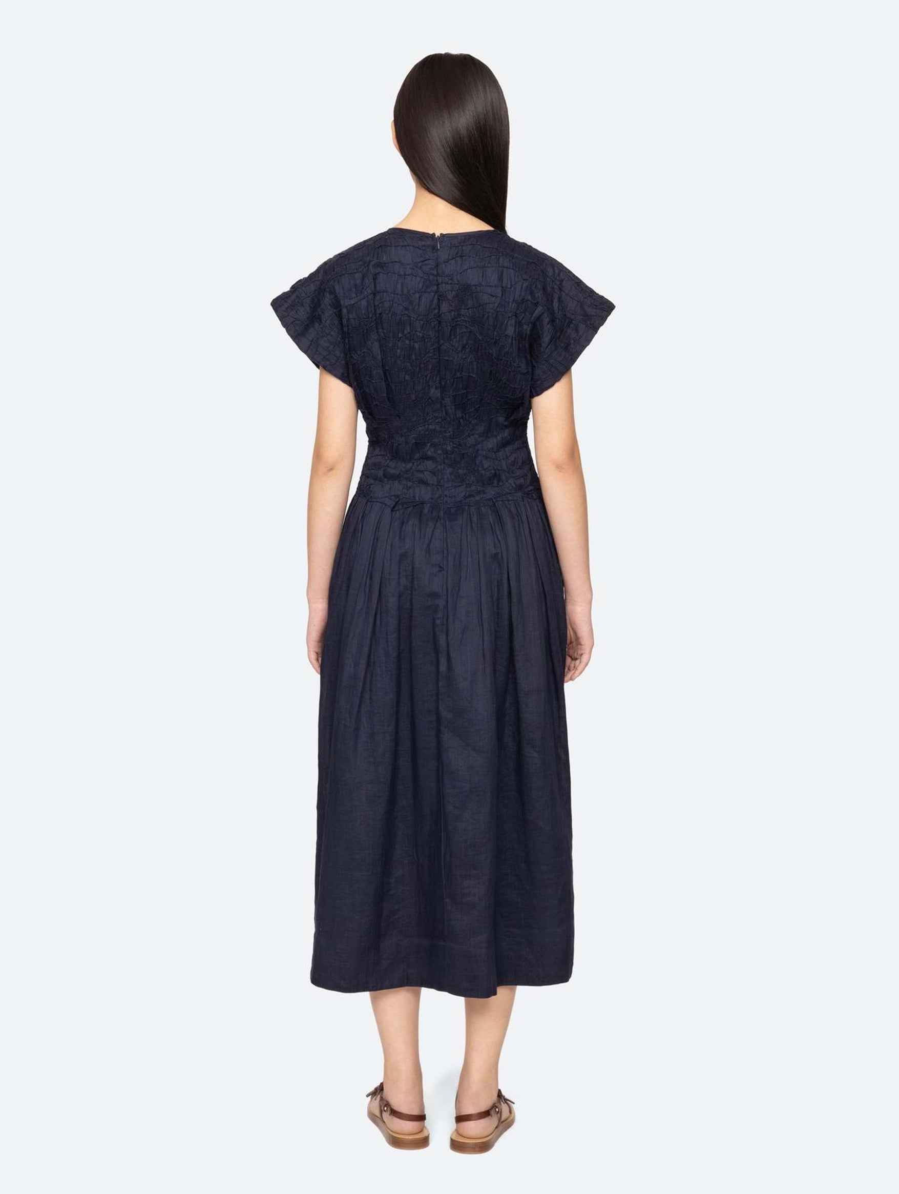A study in refined ease and timeless femininity, the Imogen Midi Dress is cut from breathable, artisan-woven ramie and detailed with delicate pintucks that add dimensional texture to its streamlined silhouette. Finished with a softly flared skirt that falls just below the knee, short flutter sleeves, and an invisible back zip, this midi feels understated yet considered. Perfect for effortless daytime elegance or laid-back evenings.