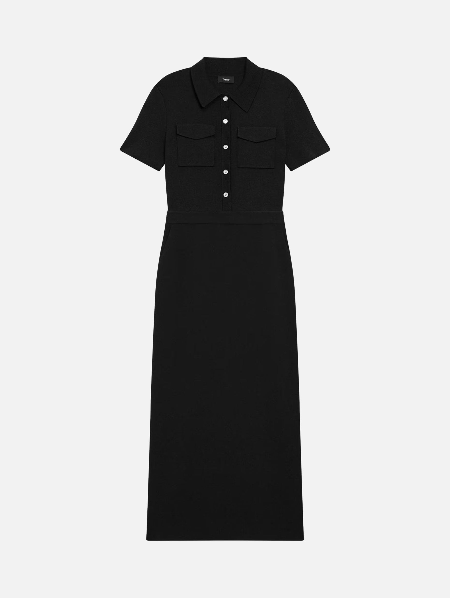 Theory's Military Midi Dress is tailored in their signature Japanese Admiral Crepe for a smooth and softly draped fit that maintains a polished appearance. Its slim silhouette features a partial button front closure to meet a pointed collar, short sleeves, a pair of front flap pockets, hip slip pockets and zipped up the side.