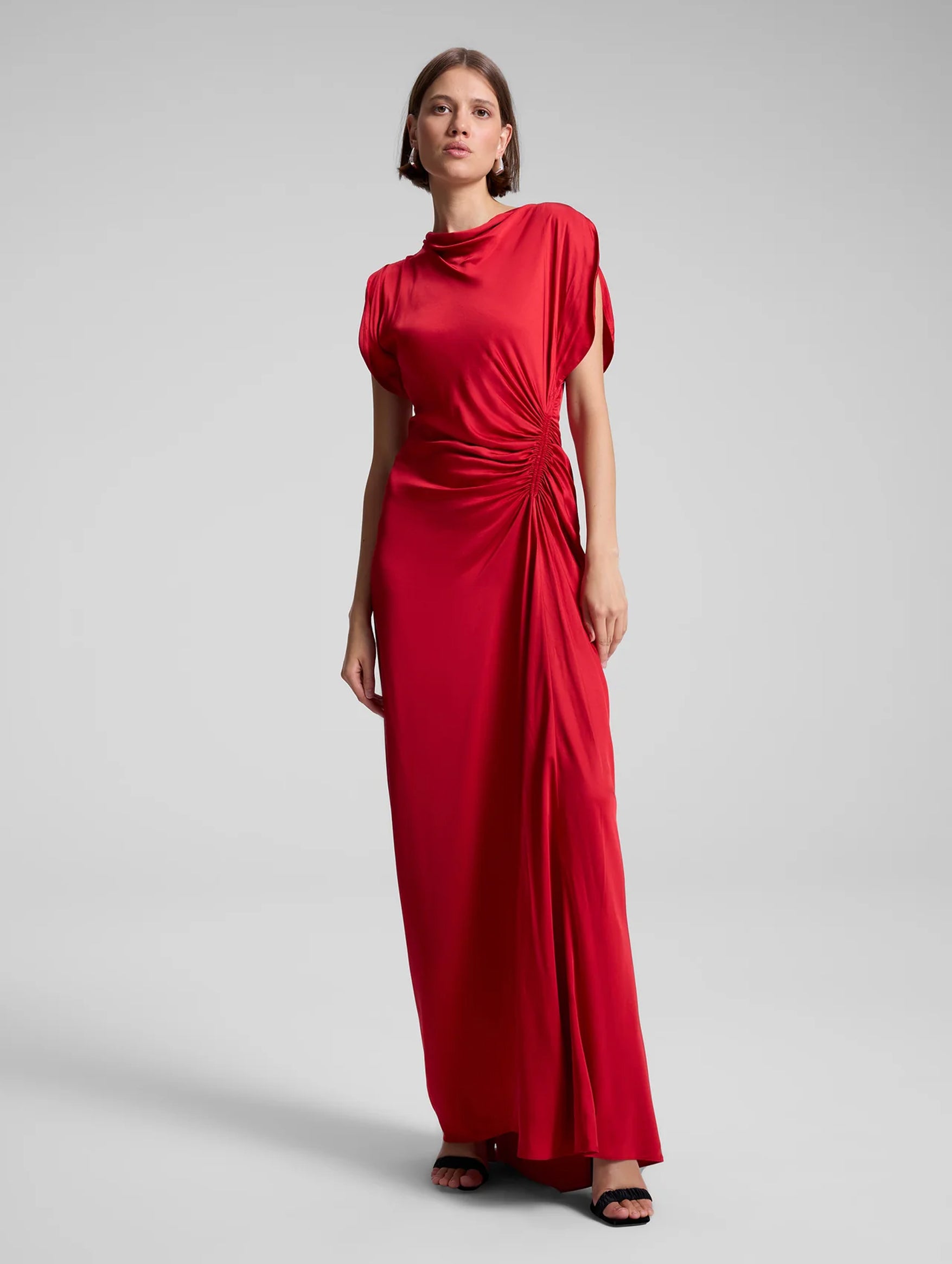 The Nadia Satin Gown from ALC is crafted from our fluid satin fabric in a vibrant red hue. This full-length silhouette features an elegantly draped cowl neckline and short sleeves with slits for added movement. Gathering along the curved seam through the hip creates another focal point, flowing into a draped hemline with beautiful movement. Pair with metallic heels and statement earrings for a sleek holiday look.