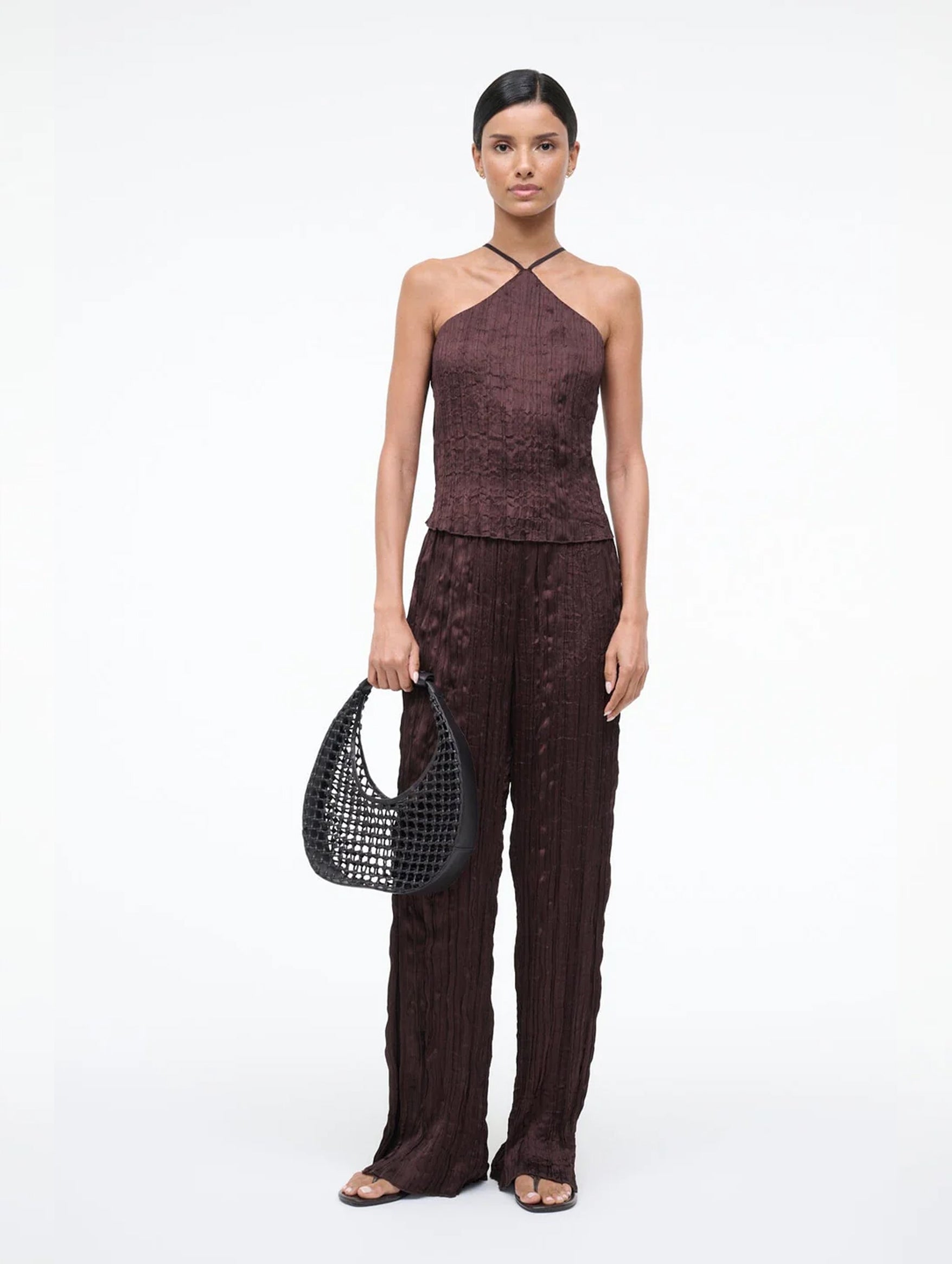 Effortless and refined, the Nami Pant from STAUD is a sleek take on relaxed tailoring. Cut from softly pleated satin with a straight‑leg silhouette and easy elastic waistband, it drapes with fluid grace while offering understated polish. The subtle plissé texture and neutral tone create quiet sophistication, it’s the kind of pant that anchors a capsule wardrobe with effortless elegance.