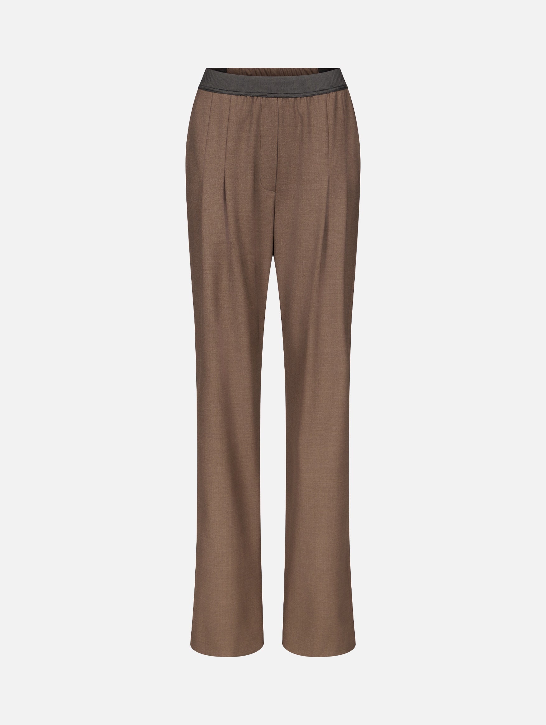 Loulou De Saison's Niro Pants in Brown offer a sophisticated blend of classic tailoring and modern comfort. Crafted from virgin wool grain de poudre, they feature a straight fit with double front pleats, creating a refined silhouette. The elasticated waistband introduces an element of ease, balancing formality with relaxed wearability. The perfect pair to take you through every season.
