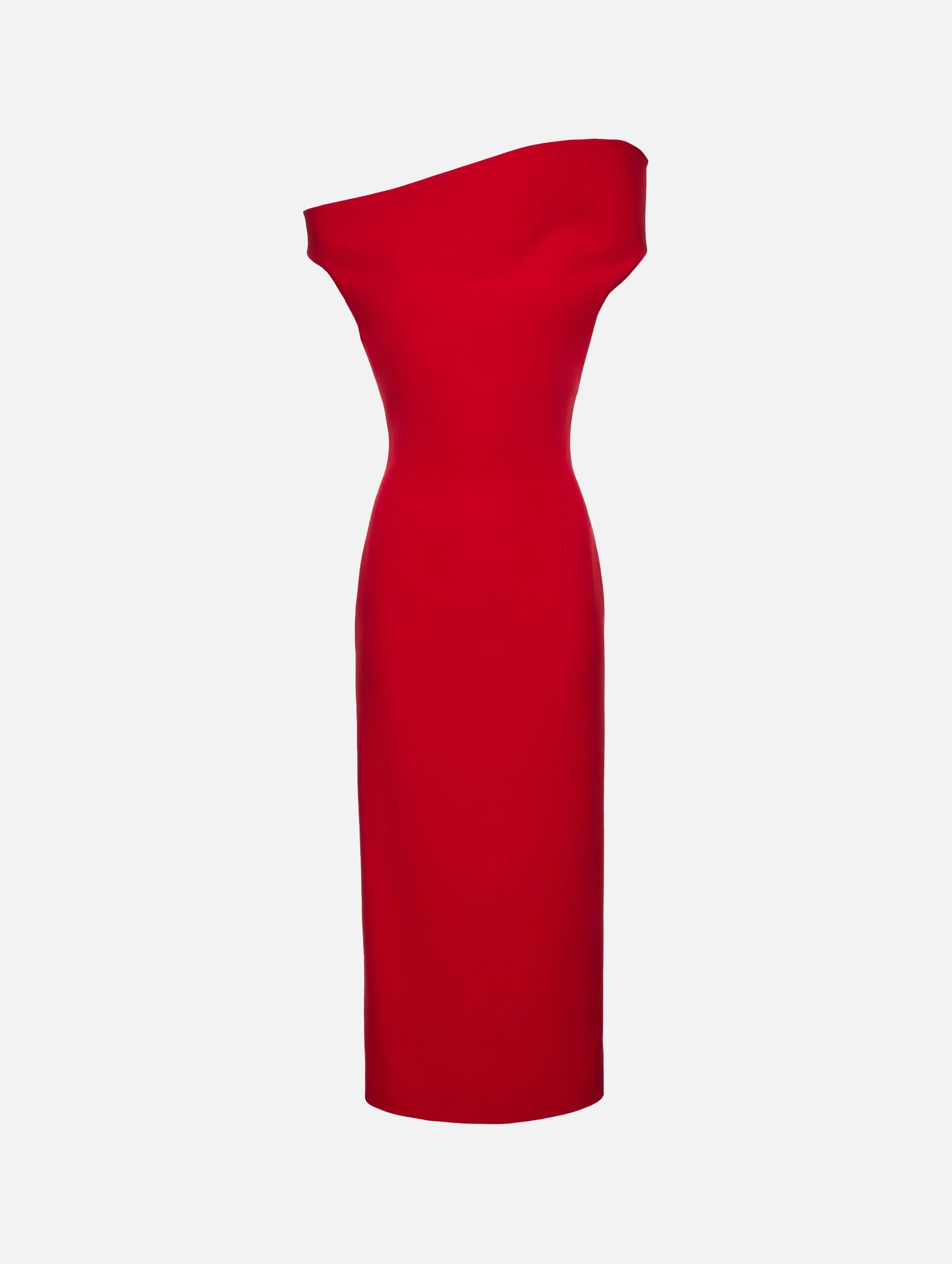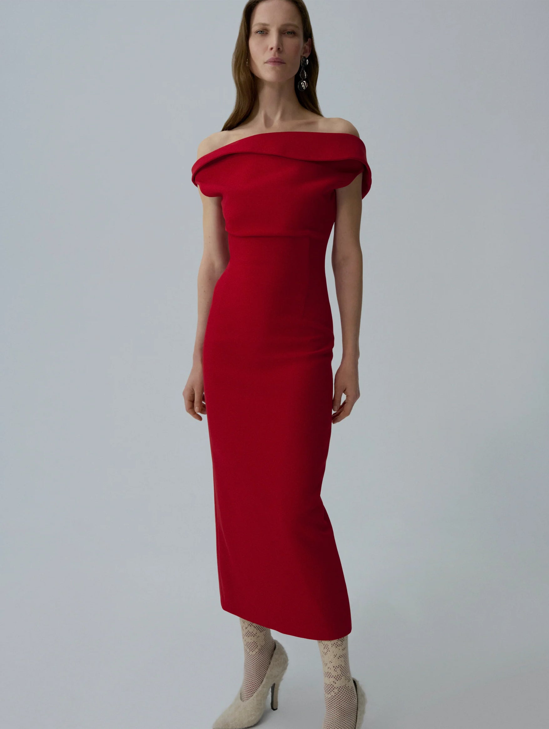 Embodying timeless sophistication, the Off Shoulder Midi Dress in Red by Magda Butrym is a masterclass in sculptural design. Crafted from a rich wool-elastane blend, this ankle-length dress features a wide, elevated off-shoulder neckline that gracefully frames the collarbones and shoulders. The fitted bodice, reinforced with side boning, offers structured support, with subtle back slit to provide ease of movement. This piece is a statement of refined elegance and modern femininity.