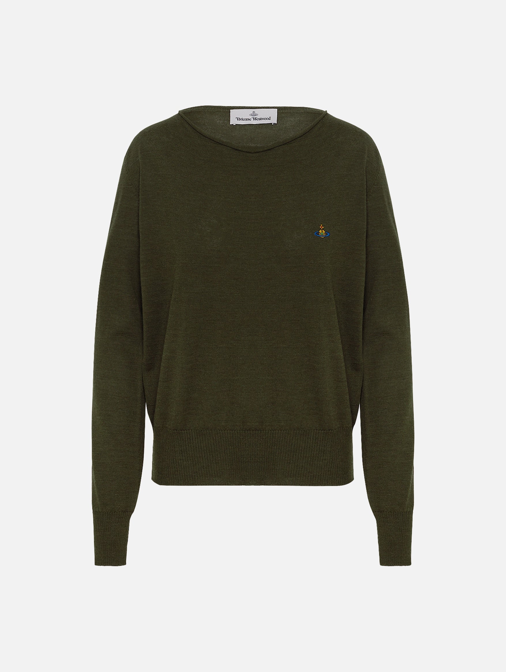 The Vivienne Westwood Pamela Orb‑Embroidered Sweater is a refined statement of understated elegance. Crafted from a soft cashmere-blend knit, it offers a relaxed yet polished silhouette, anchored by ribbed trims and a classic crew neckline. The embroidered golden Orb motif adds Westwood’s signature touch making this piece effortless in its diplomacy between cozy and couture.