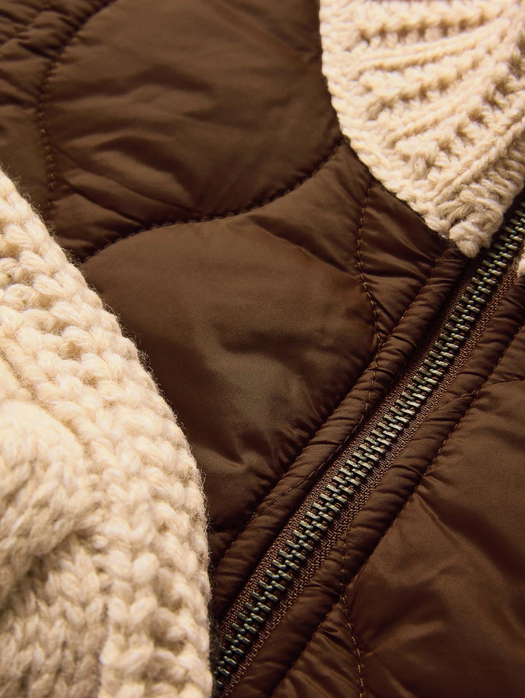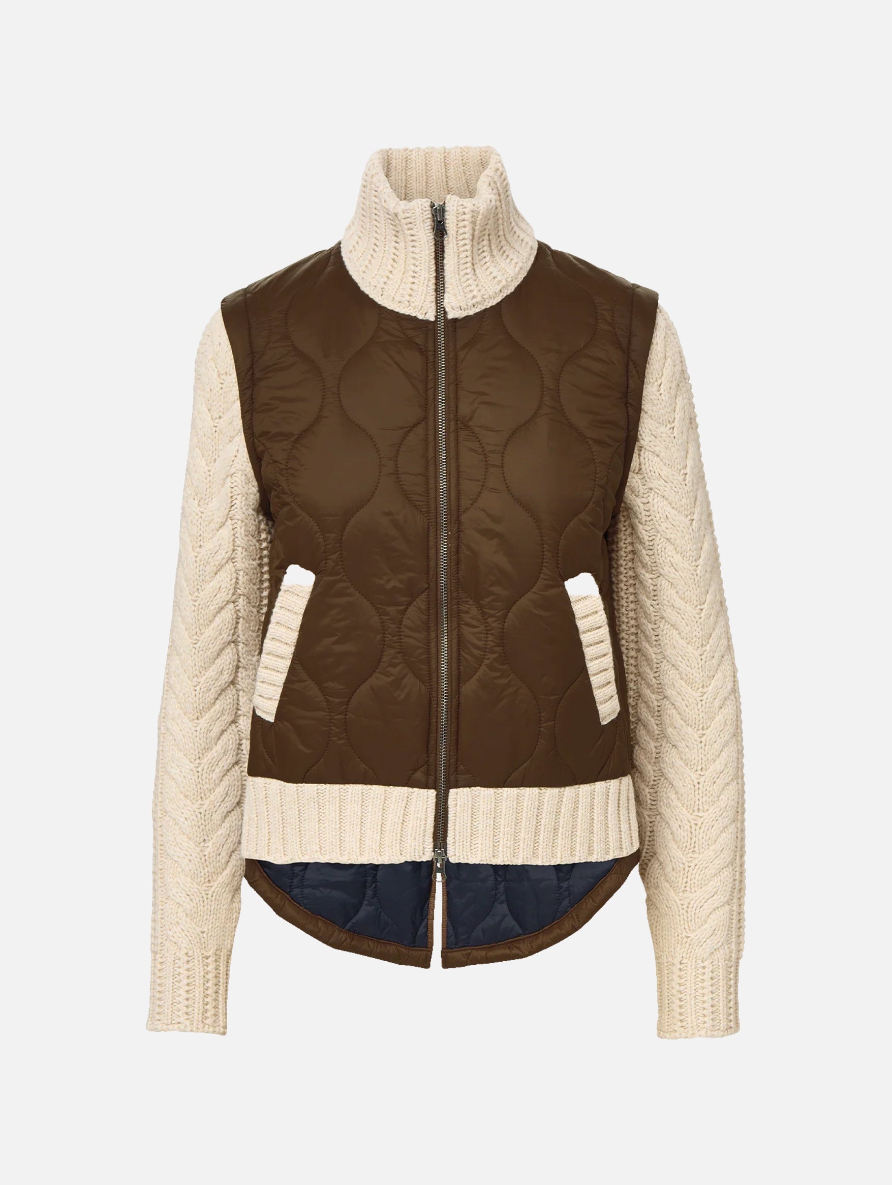Meet the jacket that effortlessly combines cozy with chic. Veronica Beard's Patra Jacket features a contrast of quilted shell on the body and soft cable-knit wool-blend sleeves, offering both warmth and texture in one refined piece. Designed to be cropped in the front and longer in the back, it balances silhouette beautifully. A chunky knit stand collar, ribbed trim, and practical patch pockets complete the look. It’s the perfect transitional layer that elevates both casual jeans looks and polished outfits alike.