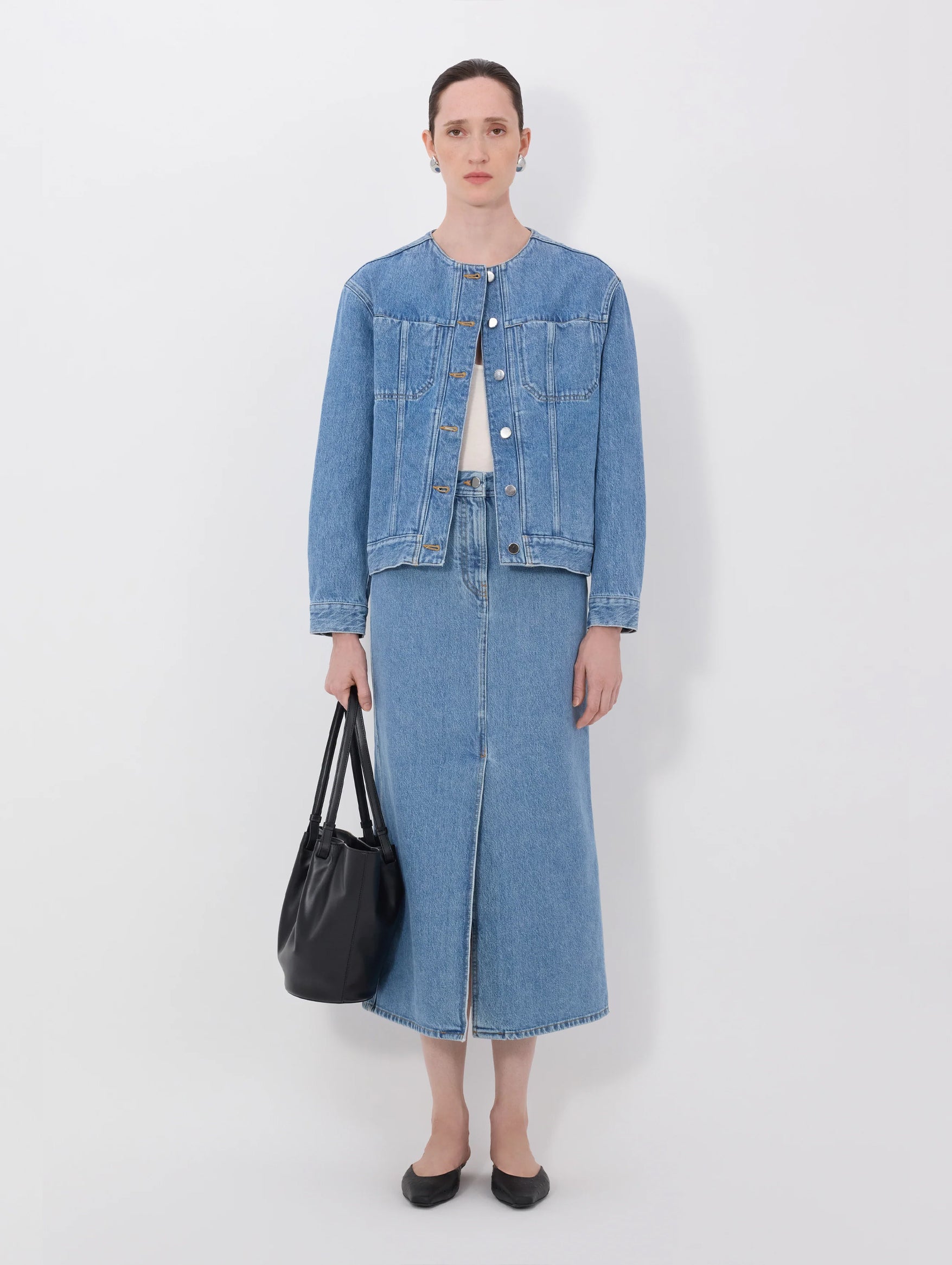 The Loulou de Saison Rima Collarless Denim Jacket in Washed Light Blue is an effortless blend of relaxed ease and quiet refinement. Cut from softly washed cotton with a relaxed silhouette, it features a gentle collarless neckline, breast patch pockets and side pockets that make it a classic with a twist. Wear it with sandals for daytime ease or elevated with heels and delicate accessories for the evening,