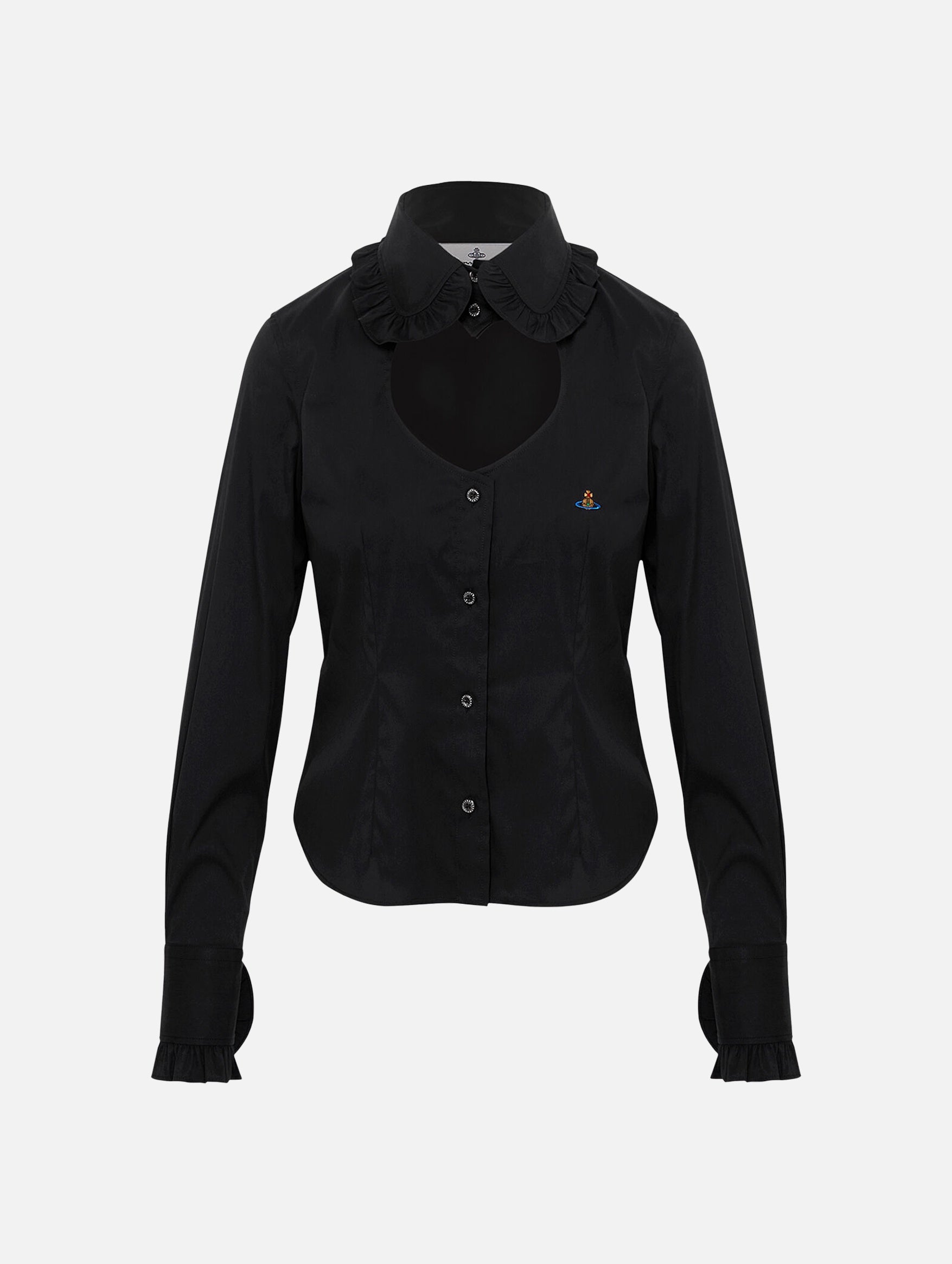 The Vivienne Westwood Toulouse Cotton Frill Shirt in Black is a romantic reinterpretation of a classic silhouette. Crafted from crisp organic cotton, it features a sculpted fit that flatters the form, complete with delicate frill detailing along the collar and cuffs. The curved hem and precise darting create subtle structure, while the embroidered Orb motif adds a quiet note of rebellion. A timeless piece that balances Victorian femininity with Westwood’s signature edge.