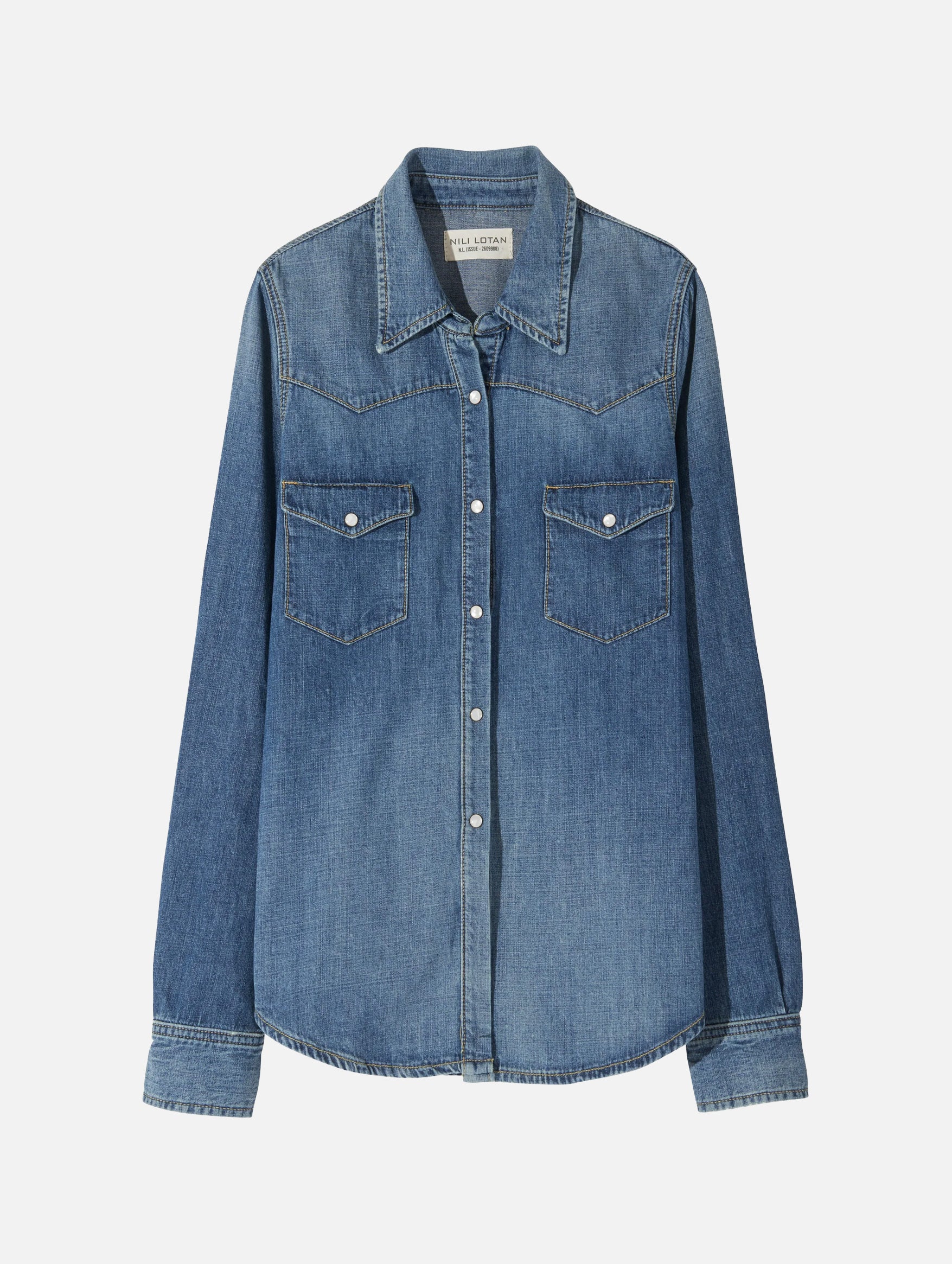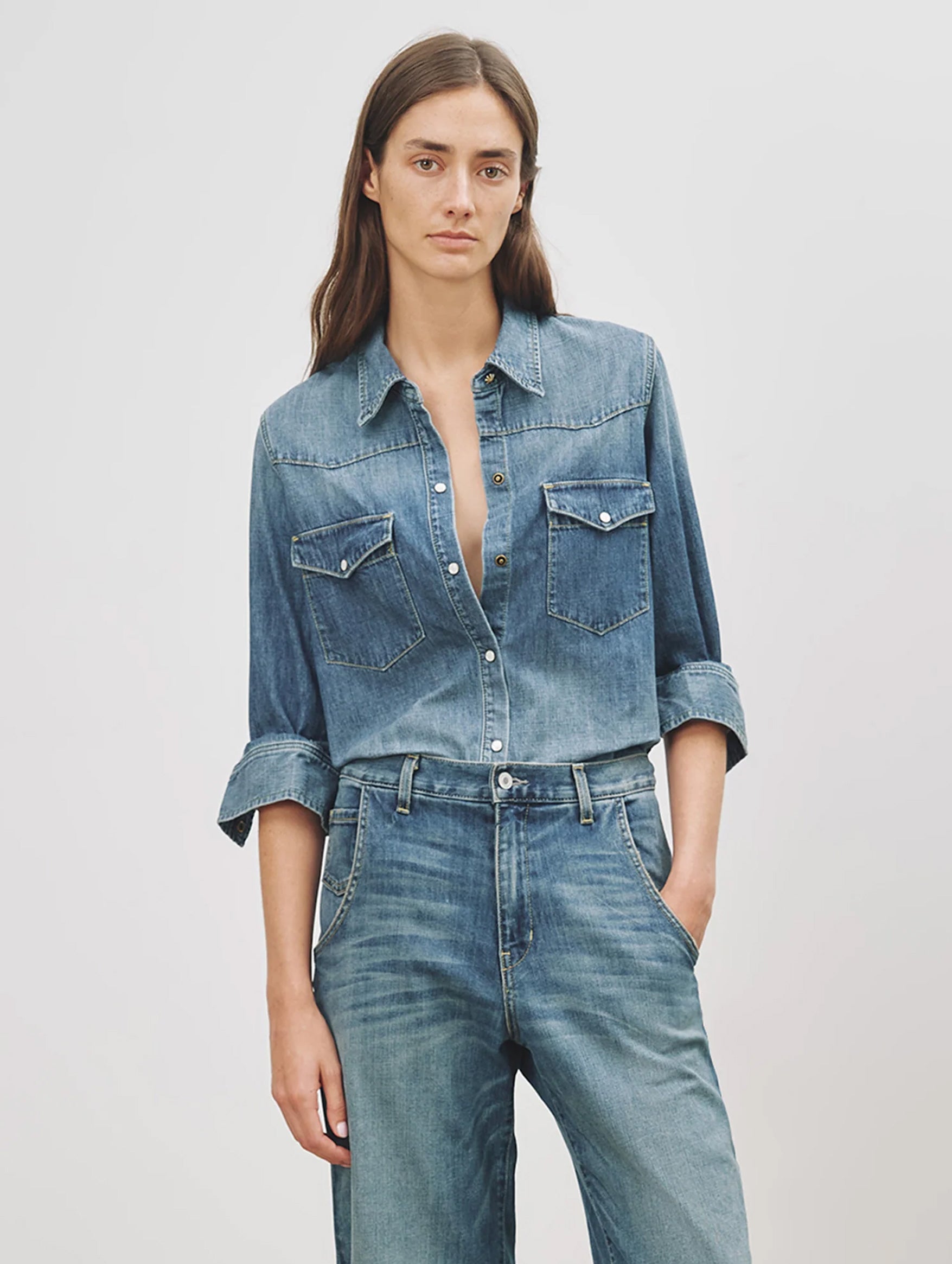 A Nili Lotan essential and a true wardrobe hero, the Travis Shirt encapulates vintage western charm to create a chic option for everyday styling. A classic button-down with a collared neckline and detailedwith silver hardware and double chest pockets, rendered in a soft stretch denim. Best worn with your treasured pair of jeans for a denim on denim look you cant go past.